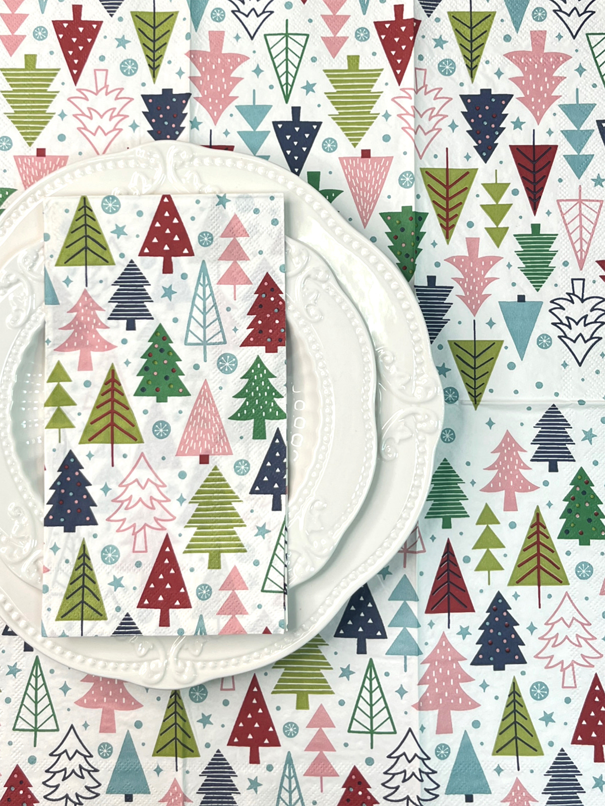 Aceste șervețele pentru invitați din hârtie de Crăciun cu 3 straturi, Șervețele decorative pentru pom de Crăciun prezintă pomi de Crăciun colorați și fulgi de zăpadă pe un fundal alb, aceste elemente clasice pot îmbunătăți atmosfera festivă a petrecerilor și adunărilor de Crăciun.