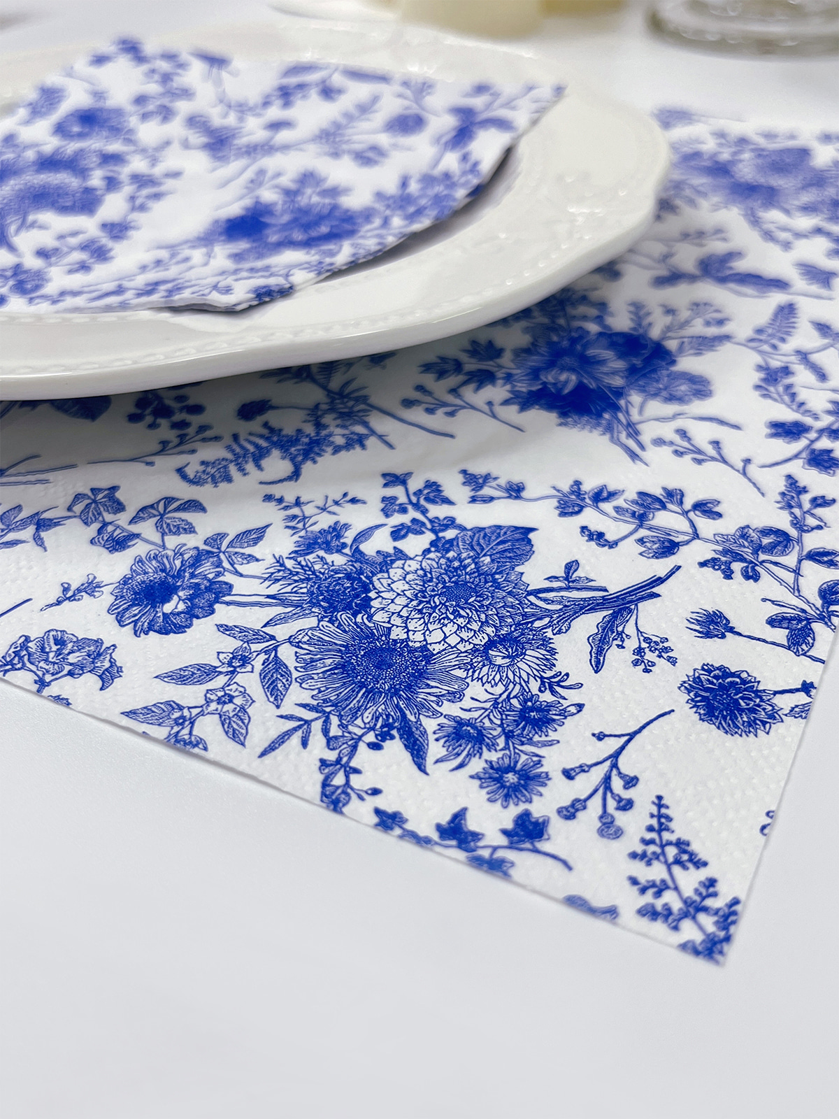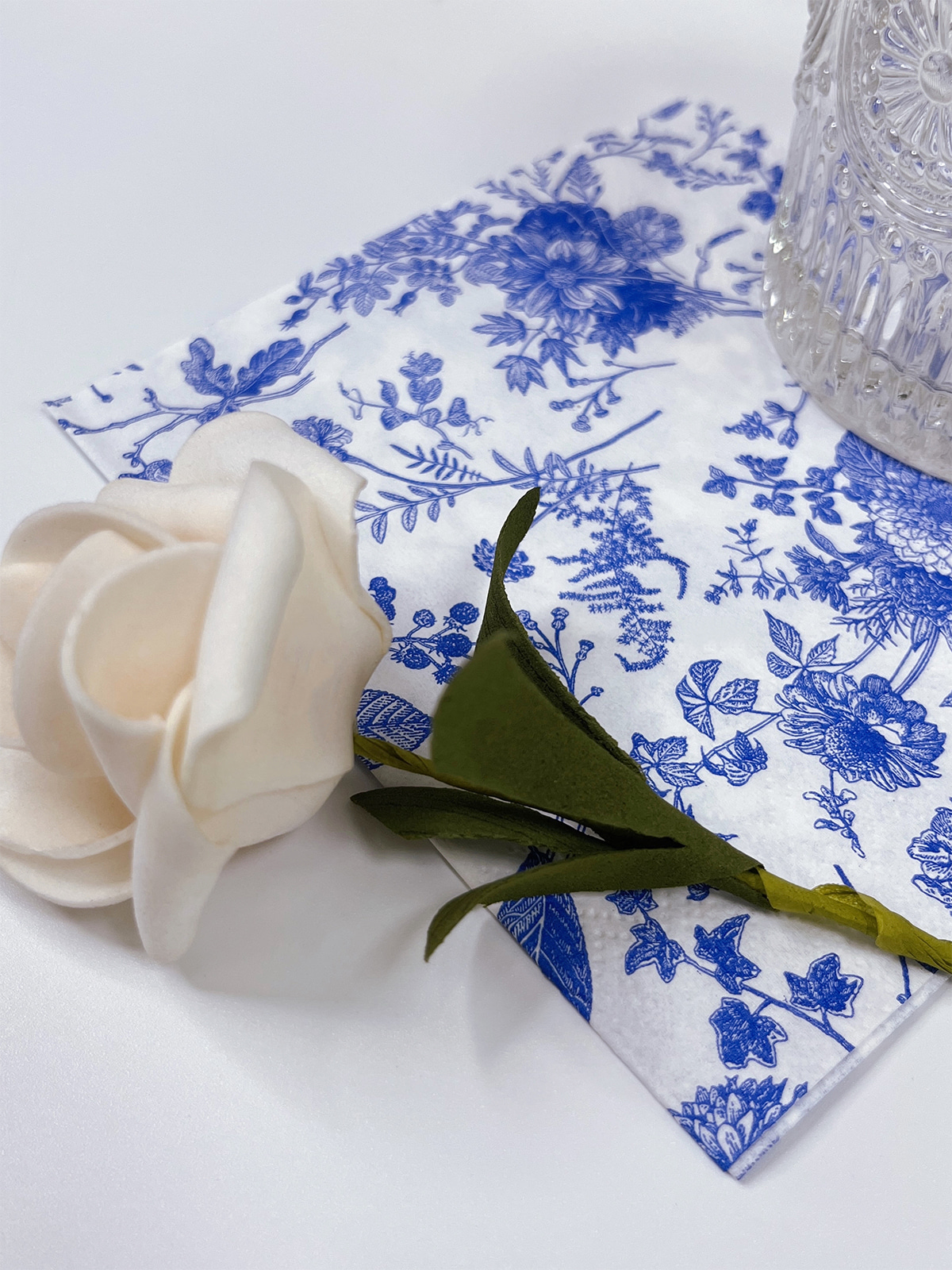 Aceste șervețele de hârtie pentru cocktail de unică folosință, șervețele pentru petreceri cu flori albastre și albe prezintă un design floral albastru pe un fundal alb. Aceste șervețele decorative sunt suficient de elegante pentru a adăuga farmec mesei tale.