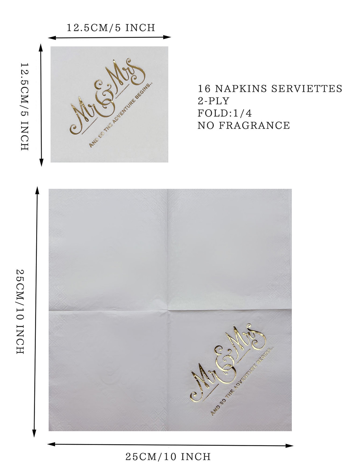 Aceste șervețele de nuntă Mr&Mrs din folie aurie sunt disponibile în șapte culori diferite din care să alegeți pentru a se potrivi cu diverse teme de decorare a nunții. Designul lor simplu, dar elegant, adaugă farmec setărilor de veselă și îmbunătățește atmosfera de petrecere.