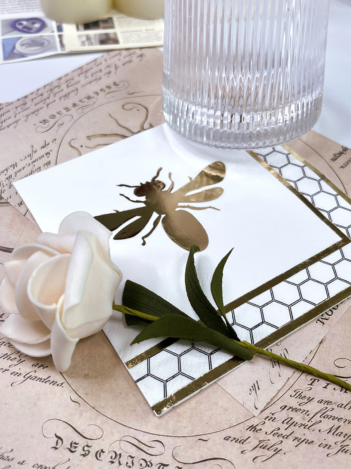 Șervețelele de cocktail albine din folie aurie sunt concepute în mod viu, având în vedere eleganța, făcându-le decorațiuni de petrecere de înaltă calitate, potrivite pentru nunți, cine, băi și multe altele.