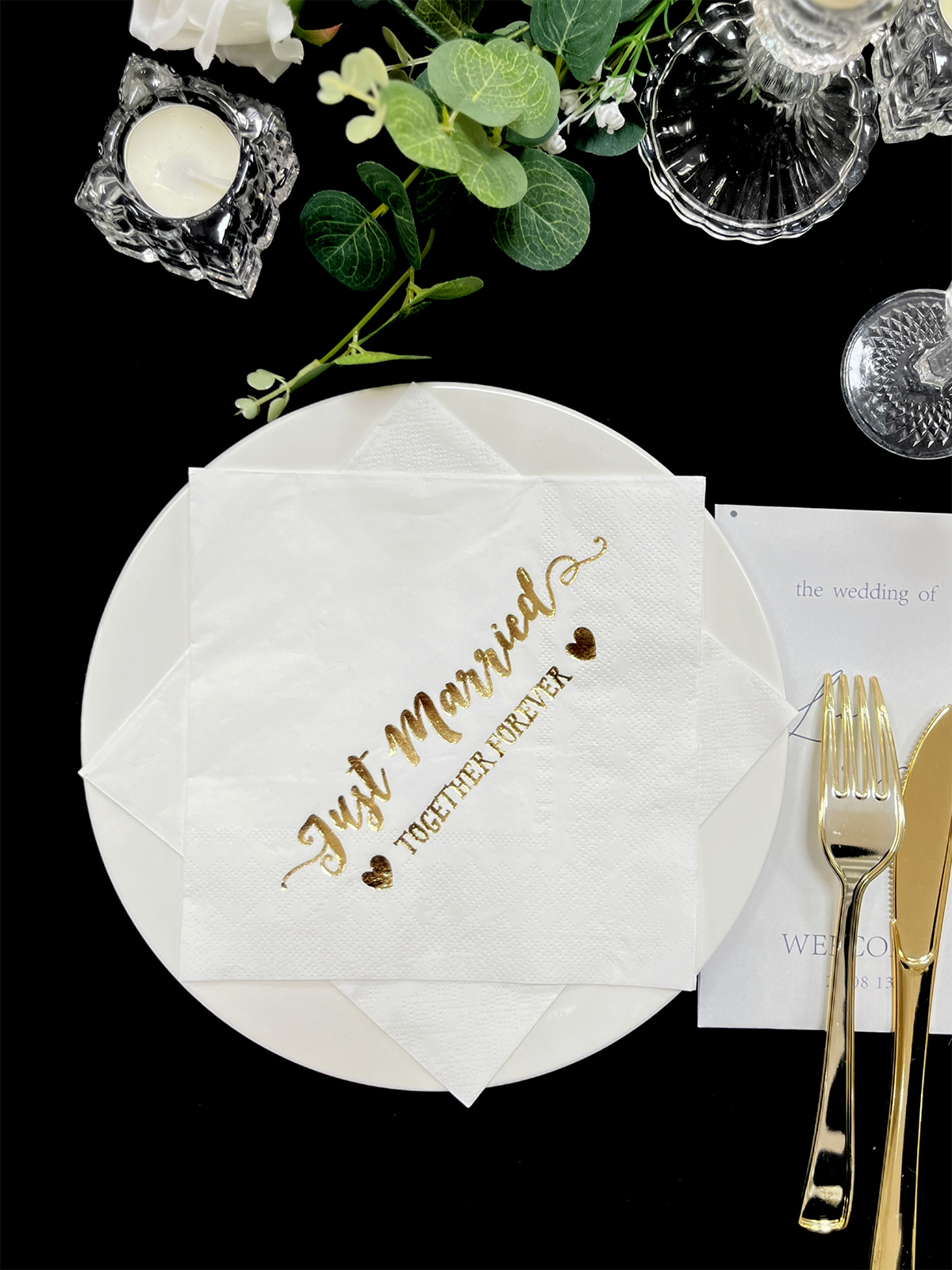 Aceste șervețele de prânz au un design simplu, dar elegant, cu folie de aur „abia căsătorite” pe hârtie albă, sporind farmecul veselei tale și creând o atmosferă primitoare de petrecere.